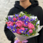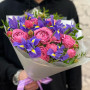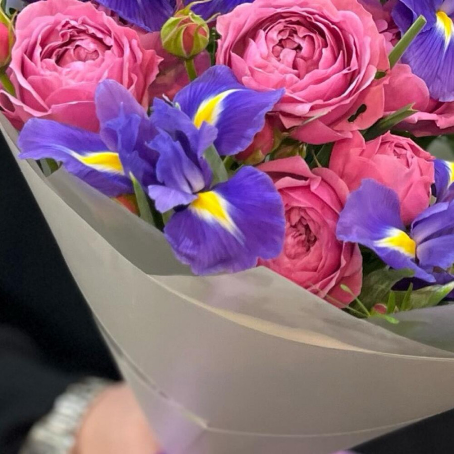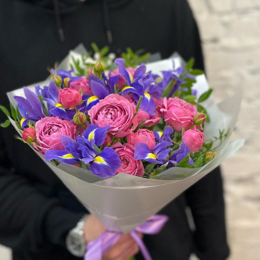 Букет из розовых пионовидных роз и синих ирисов в Соколе