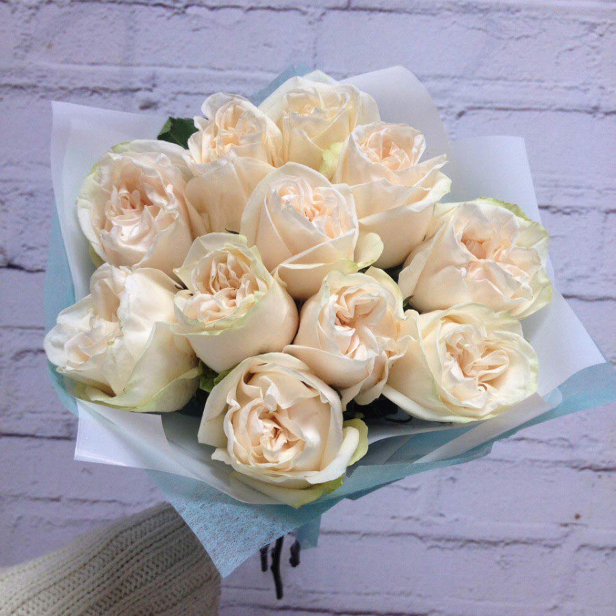 Восхитительный букет из 11 жемчужных пионовидных роз с нежными волнистыми лепестками в небесно-голубой упаковке. Этот воздушный букет не оставит равнодушной ни одну, даже самую изысканную особу, став идеальным подарком на первом свидании или же теплым напоминанием о Ваших искренних чувствах.